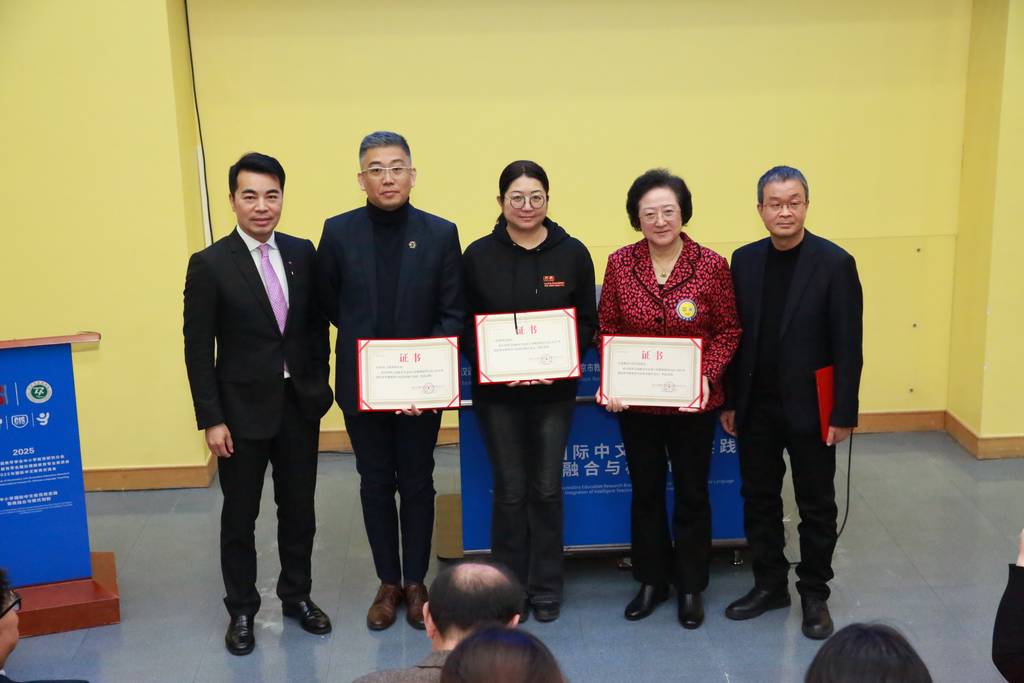 闭幕式环节,研究分会副理事长张晓慧致辞。她系统回顾了本次交流会的整体议程与核心成果,强调了本次会议在推动国际中文教育数智化转型、促进跨区域学术交流、凝聚行业发展共识等方面的重要学术价值与实践意义,倡导广大国际中文教育工作者加强 AI 智慧教育与学科教学融合的理论研究与实践探索,持续提升专业研究素养与教学实践能力,力争在国际中文 AI 智慧教育领域发挥引领示范作用。交流会期间,人教社、外研社、北语社等多家支持单位举办了国际中文教育优质教材图书、文化创意教学资源展示活动。闭幕式上,研究分会领导分别为新聘任专家、学术交流分享代表和支持单位颁发了聘书、荣誉证书和参展证明。