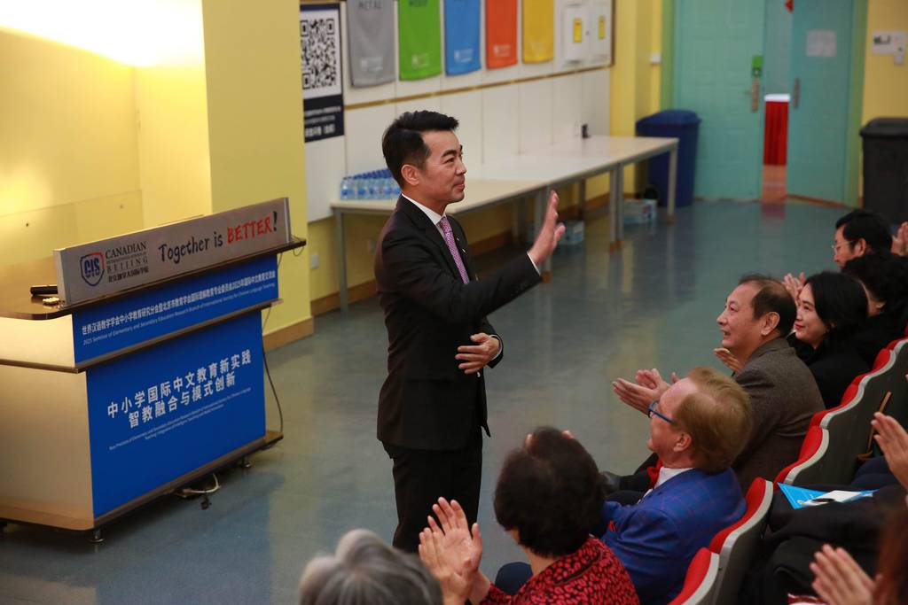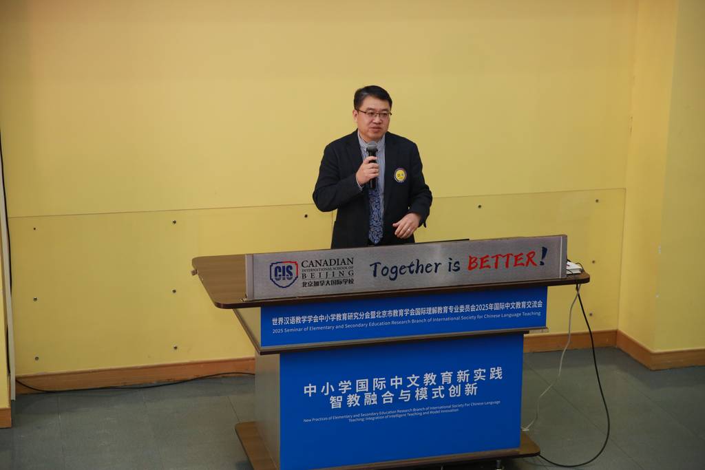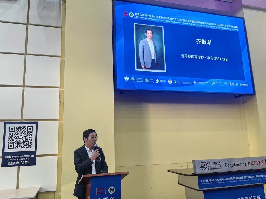 开幕式环节,研究分会理事长张志雄(Andy Truong)发表致辞。他从语言习得关键期理论出发,强调中小学阶段是语言认知启蒙与文化身份建构的黄金发展期。当前,人工智能技术与教育教学的深度融合正推动国际中文教育突破传统时空桎梏,实现教学场景的泛在化与教学模式的革新。本次交流会旨在搭建跨文化、跨区域的学术交流平台,聚焦国际中文教育前沿实践成果,促进创新教学理念的碰撞与融合,推动中文教育向更具生动性、高效性与适配性的方向发展,更好契合国内外青少年的语言学习与成长需求。北京市芳草地国际学校(教育集团)校长齐振军在致辞中指出,朝阳区作为北京市国际教育高质量发展示范区,已将国际中文教育学术交流纳入区域教育国际化发展战略布局,并正式发布《朝阳区教育国际化高质量发展三年行动计划》。芳草地国际学校依托 60 余年的办学积淀,在人工智能技术与国际中文教学的融合路径探索方面形成了系统性实践成果,为中小学国际中文智慧教育的理论建构与实践推广提供了宝贵的实证经验。